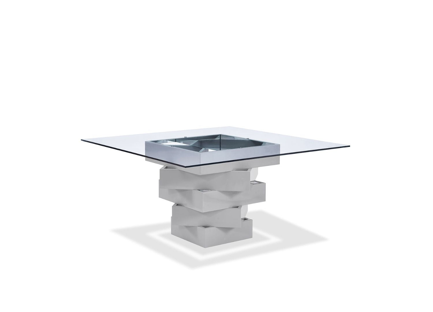 - Materials: Clear glass top, square base in high gloss light grey lacquer